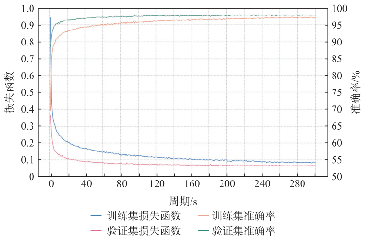 3 D4 r. S( L% y5 z( N 图6为ResNet模型训练结果,由图6可见,训练集初始准确率为69.6%,损失函数值为0.94;模型在100个周期后逐渐达到收敛,训练集准确率在97%上下浮动,损失函数值约0.09;训练集准确率最大值97.4%出现在第274周期,此时损失函数为0.08;训练结束时准确率为97.1%。验证集初始准确率为88.6%,最大值出现在第215周期,准确率为98%,训练结束时准确率为97.9%。