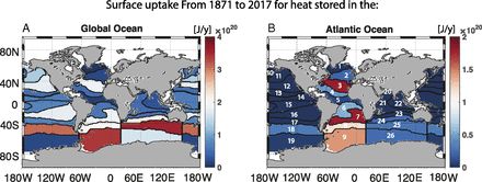 研究发现全球2000米以上的海洋在此期间吸收的热量为0.30±0.06 W/m2,2000米以下为0.028±0.026 W/m2,年代波动较大。自1871年以来的总OHC变化估计为436±91×1021 J,且在1921-1946(145±62×1021J)期间增加,与1990-2015年期间一样大。通过与直接估算进行比较,推断在1955-2017年期间,由于海洋运输变化引起的热量传输,导致了一半的大西洋变暖以及低纬度到中纬度的热膨胀海平面上升。 & ~' x# K9 i$ i# [: i7 w, ]