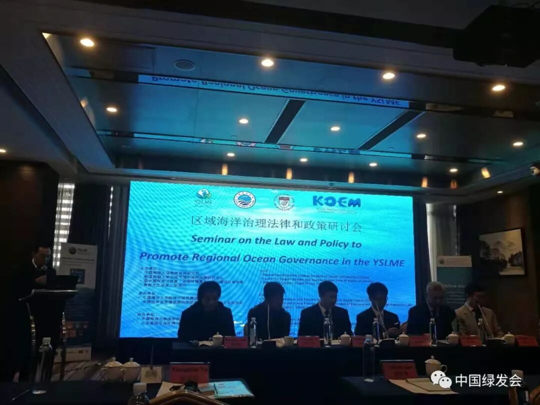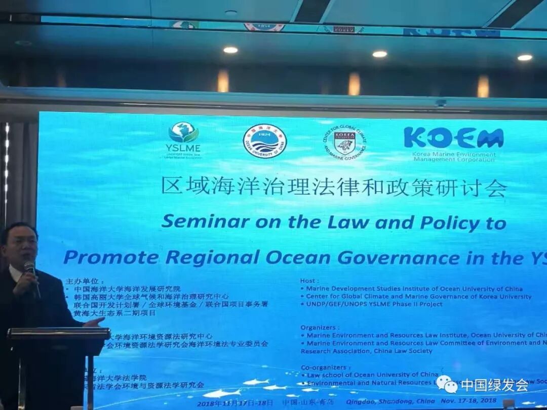 4 l' Z* s$ ~, E 在开幕式环节,黄海大海洋生态系(YSLME) 二期项目管理办公室首席技术顾问郭寅峰先生、中国法学会研究部李存捧部长、韩国高丽大学全球气候与海洋治理中心郑瑞荣教授、中国海洋大学海洋发展研究院庞中英院长分别致辞,中国法学会环境与资源法学研究会副会长兼秘书长、武汉大学法学院副院长秦天宝教授宣布成立中国法学会环境资源法学研究会海洋环境法专业委员会的决定,徐祥民教授为海洋环境法专业委员会主任委员,绿会副秘书长马勇受聘为海洋环境法专业委员会委员。 " t/ s# l0 K5 ^5 [* B