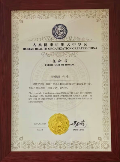 $ y! b& {7 }! T* }. w近日,经人类健康组织创始人苏琳主席和副主席赵振东先生的真诚邀请,太平绅士,爱国人士,社会活动家,外交家,香港国际商会联合体华国中主席、中医世家、全国老龄委自然疗法专家组成员、中国红十字总会事业发展中心高级顾问姚伟谊先生共同荣任人类健康组织大中华区荣誉主席。8 |% K, ~# [" T- O. j7 T8 t