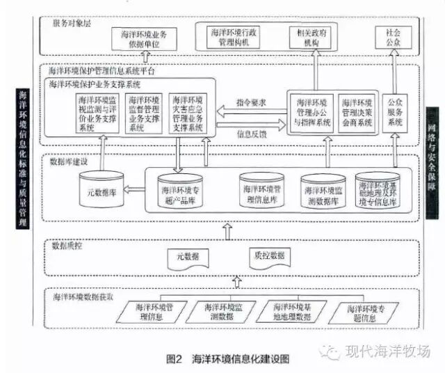 3 W' j+ J. K* \" v8 f! a) q 建议中国气象局、中国地震局、原水利部水文局合并成立国家气象水文地理中心,整合气象、地理、水文和海洋监测和研究力量,减少部门间不必要的重复性监测,加强部门间协作,使海洋环境质量监测真正实现系统化和整体化。加强科研与监测的有机结合,注重科研成果在海洋监测实际工作中的推广应用,提高监测质量水平。增加经费投入,改进海洋监测的技术装备,使海洋环境监测技术装备现代化,并着力加强海洋环境信息化建设(建设路径见图2)。