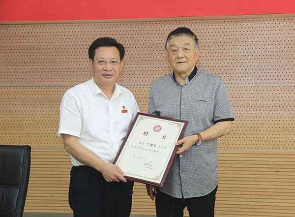 " O7 V8 a5 X% ~; T+ g( W" Z6 e仪式上,沈灿煌为丁德文院士颁发聘任证书,佩戴校徽。 3 C& k* R8 \ t L' h A5 E