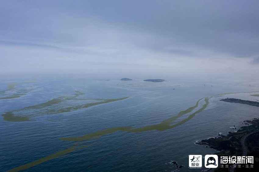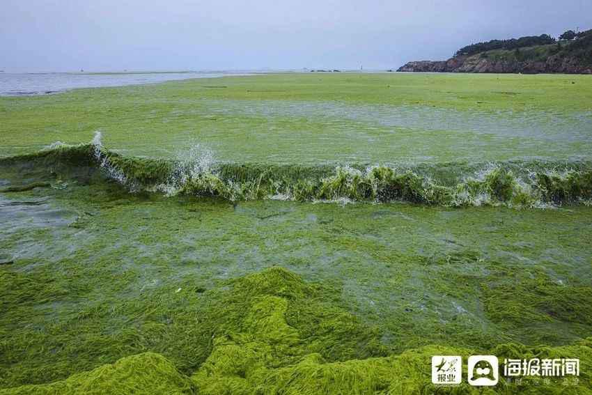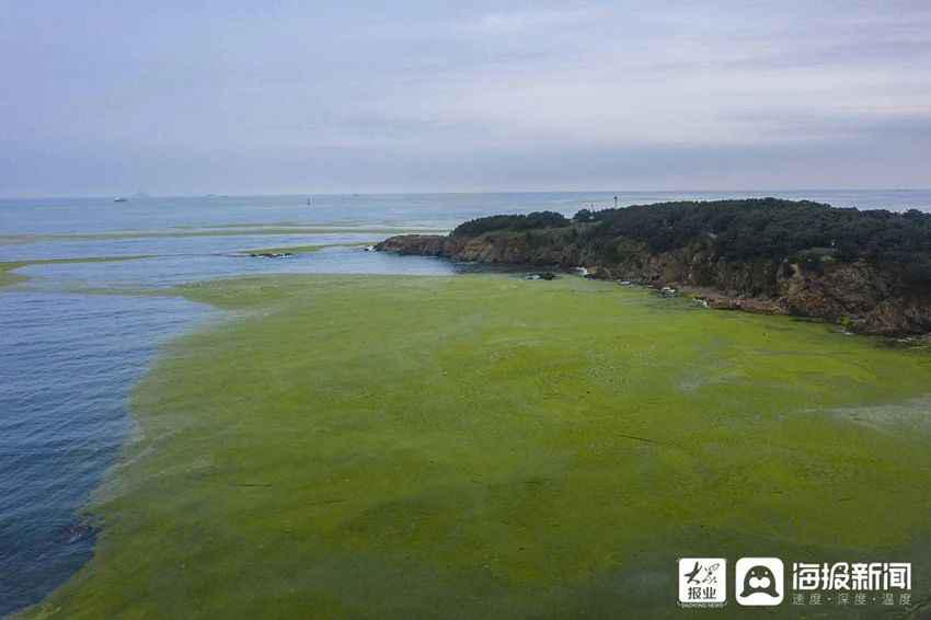 2021年6月27日,青岛胶州湾湾口和黄海上,绿色的浒苔如“绿毯”般侵袭大海。