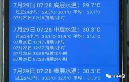 9 m, S5 ?" R# l/ W" E* X1 L( {, }大连海洋大学海洋科技与环境学院副院长 宋军:7月19日的时候,我们市(大连市)底部的海水的最高温度已经超过30度了,这个值是来得比往年要提前,而且要猛烈一些。因为今年大连市的降水比往年要多40%,所以我们盐度出现了大幅下降,渤海北部的底层养殖区的盐度从35‰降到了25‰,黄海北部现在降到了20‰。