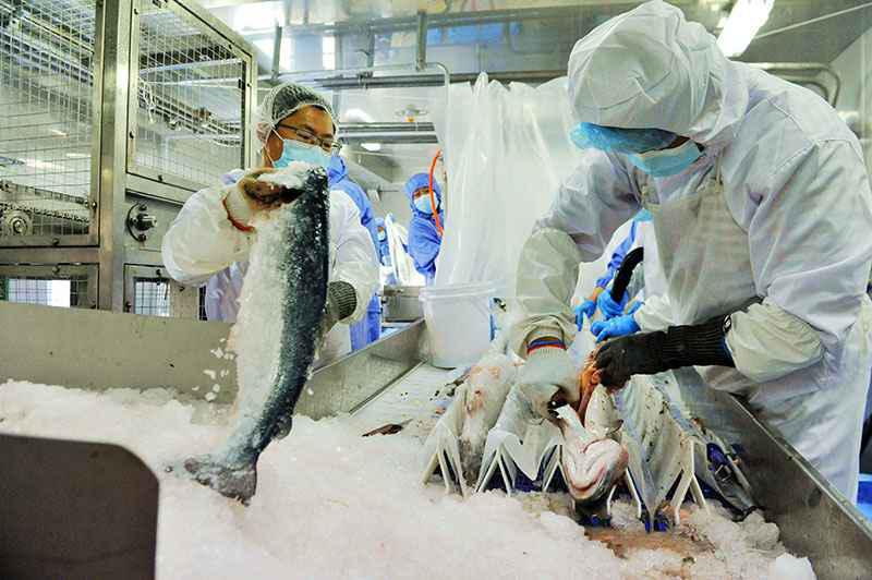 ; l5 e5 R9 U* Z/ L[size=0.24]在“深蓝1号”,工作人员在养殖工船上加工刚收获的三文鱼(6月21日摄)。新华社发(俞方平 摄)