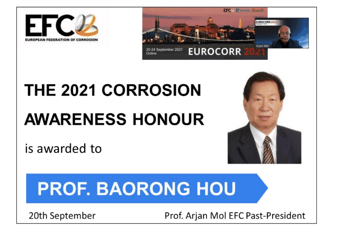 & p v: j5 Q# Z D. @# j世界“腐蚀成就奖”于2021年首次设立,由世界腐蚀组织发起,与欧洲腐蚀联盟(EFC)及中国腐蚀与防护学会(CSCP)联合举办,旨在授予具有重大影响力,显著提高了政府、科技界、工业界和公众对腐蚀及防腐重要性的认知,并在腐蚀控制领域做出杰出贡献的科学家。该奖项由世界腐蚀组织、欧洲腐蚀联盟及中国腐蚀与防护学会的委员等组成的国际评审委员会评议,不接受个人申报。经多轮投票和评议,一致推选侯保荣院士为2021年度世界“腐蚀成就奖”唯一获奖者。