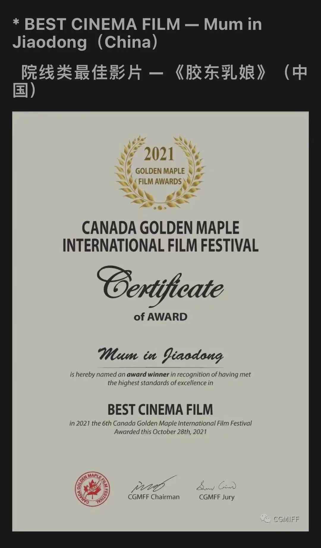 人民网威海11月5日电 11月5日,2021第六届加拿大金枫叶国际电影节单项奖获奖名单揭晓,由威海夏日盛火影视文化有限公司出品,中共威海市委宣传部、中共乳山市委宣传部、威海市文化和旅游局等联合摄制的电影故事片《胶东乳娘》,在院线影片竞赛单元中斩获最佳影片和最佳原创音乐两个奖项。