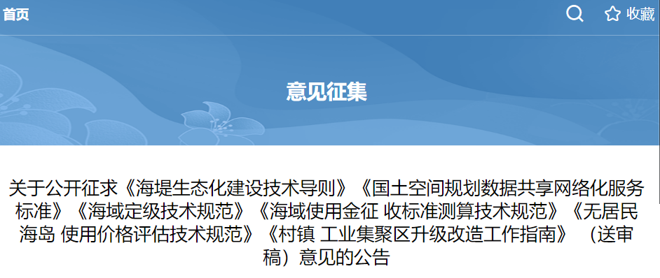 " N* u0 t3 S8 E 根据《广东省标准化条例》有关要求,现向社会各界公开征求对《海堤生态化建设技术导则(送审稿)》《国土空间规划数据共享网络化服务标准(送审稿)》《海域定级技术规范(送审稿)》《海域使用金征收标准测算技术规范(送审稿)》《无居民海岛使用价格评估技术规范(送审稿)》《村镇工业集聚区升级改造工作指南(送审稿)》(见附件1-6)等地方标准的意见。请各有关单位及个人将意见和建议填入《广东省地方标准征求意见反馈表》(见附件7),于2023年9月8日前,通过信函或电子邮件形式反馈至广东省自然资源厅科技处。