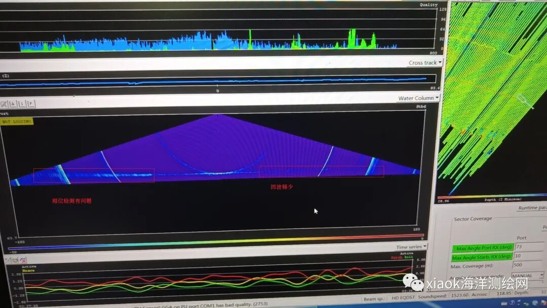 在外业采集过程中,EM2040D多波束水体图呈现了明显三段,意思就是,多波束的相位检测出现了问题。我们怀疑这是多波束老化造成的,就像Reson7125在使用后期只有振幅检测有效。