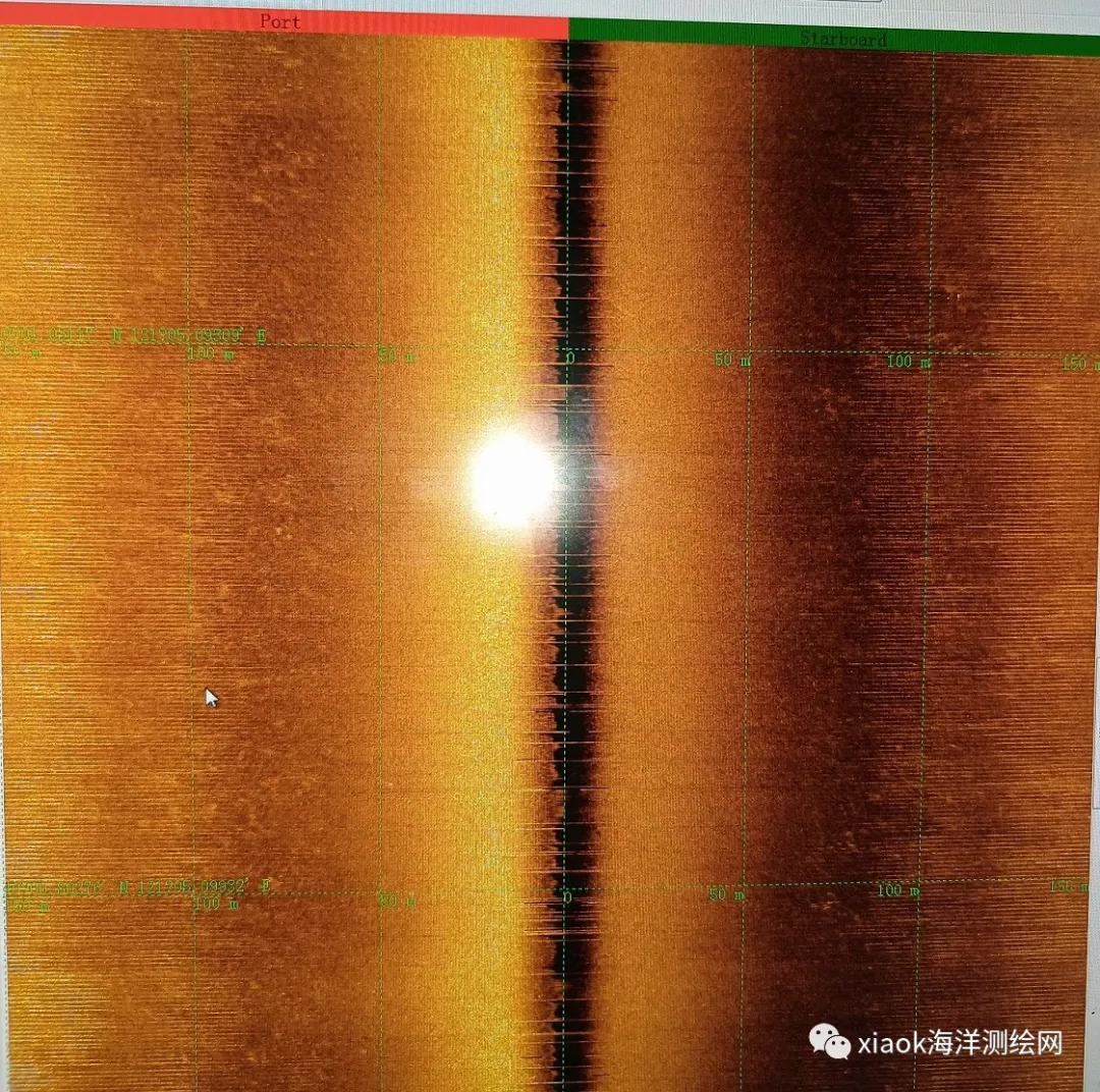 从去年10月到今年3月一直有一个困扰我们的问题:我们侧扫声纳的铠装缆在租用广西北海渔船且用发电机发电的情况下,能连接Klein3000和Klein4000拖鱼,工作一切正常,但是在我们自己的专业调查船上用船电的情况下,它能连接Klein3000拖鱼,不能连接Klein4000拖鱼。铠装缆是国内厂商提供的,跟CTD水文绞车的缆一样,中间是铜芯,外层是白色塑料隔离层,最外层是编制的钢缆。我们将其换成中间为三个芯的铠装缆以后,Klein4000也能连接上了,但是,用三芯采集的Klein4000的图像质量不如轻便缆,外侧噪声干扰明显,见下图。