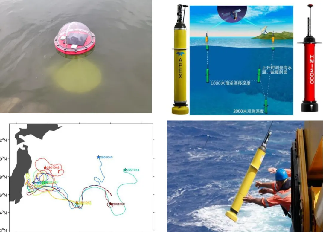 - d( n- N" P; Z& g 左上图Argo漂流浮标;左中图福岛核电站Argo浮标漂流轨迹;左下角潜标结构示意图;右上图Argo浮标工作示意图;右中图布放Argo浮标;右下和右下角三张照片是潜标布放。