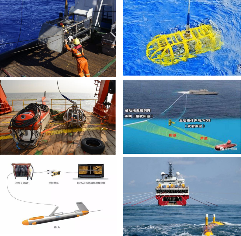 左上图摄像照相拖曳体;左中图声学拖曳体(左)和压载器(右);左下图侧扫声呐;右上图拖曳体入水;右中图拖曳探测潜艇的示意图;右下图多道地震探测。 ) \8 V2 v- O( J# I3 y: f% D/ h, a