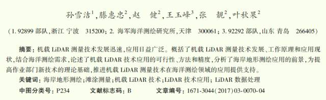 海岸地形测量是海洋测绘的重要组成部分,主要包括三部分内容:海岸线;海岸线以上一定范围内的航行方位物、道路、河流、沟渠、居民地、植被、土质等;海岸线以下干出滩、明礁、岛屿以及码头、海堤、灯塔、渔堰等重要地物。由于海道测量规范对海岸线、干出滩性质与高程、航行方位物等要素信息的测量精度要求较高[3],所以,传统海岸地形测量主要采用数字全站仪和GPS RTK等人工实地精确测量方法。随着机载LiDAR技术及其应用的快速发展,使海岸地形测量的技术创新成为可能。