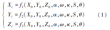 当空间一个向量,其向径为S,方向为(α,ω,κ),如能测定起点坐标(X0,Y0,Z0),则该向量的另一端点Pi(Xi,Yi,Zi)的坐标就可以唯一确定下来,见图1。而当S,α,ω,κ,X0,Y0,Z0存在一定误差时,P点的位置也会在一个误差椭球内变化。 ; |4 B6 G. ~- ]+ D$ r