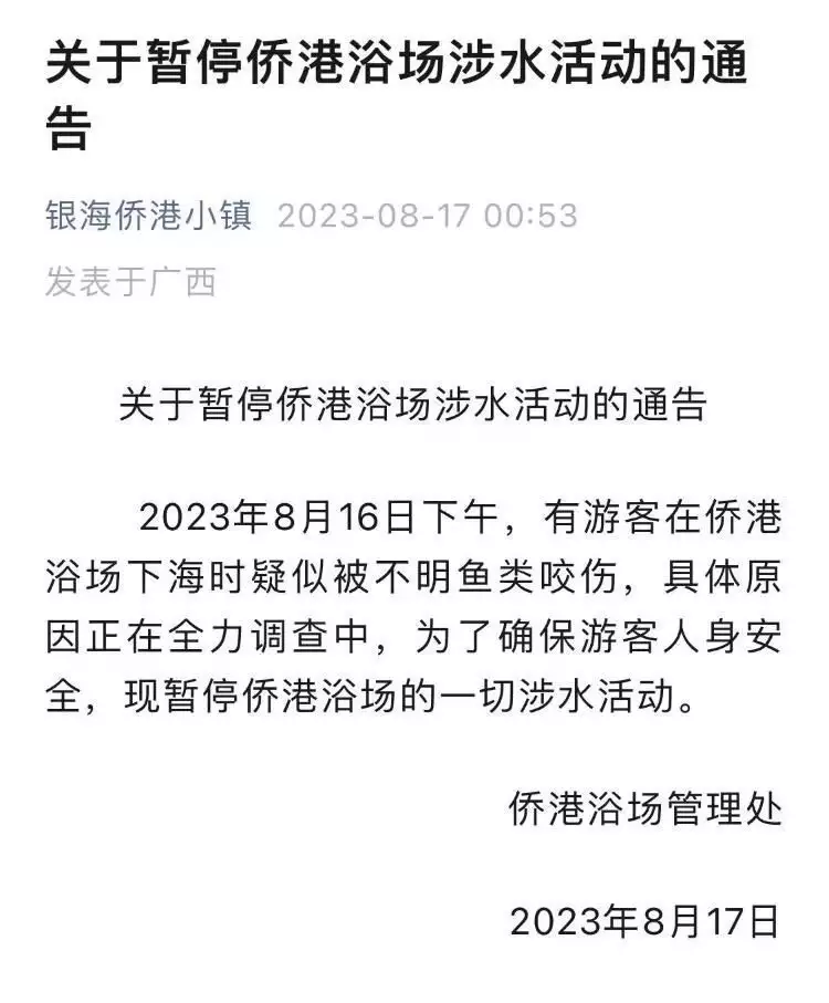 + u: t) Q z* y7 q9 t/ C 8月16日,“多名游客在广西北海侨港浴场下海游玩时被不明生物咬伤”的视频在社交平台引发关注。