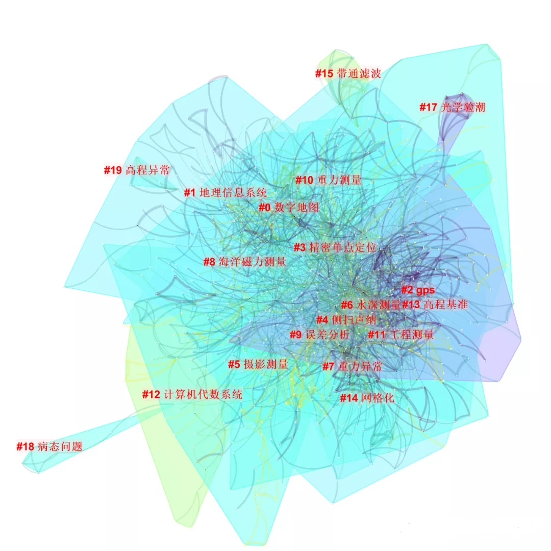 图4《海洋测绘》关键词前20个聚类分布 5 P* H- S- f z1 P* \