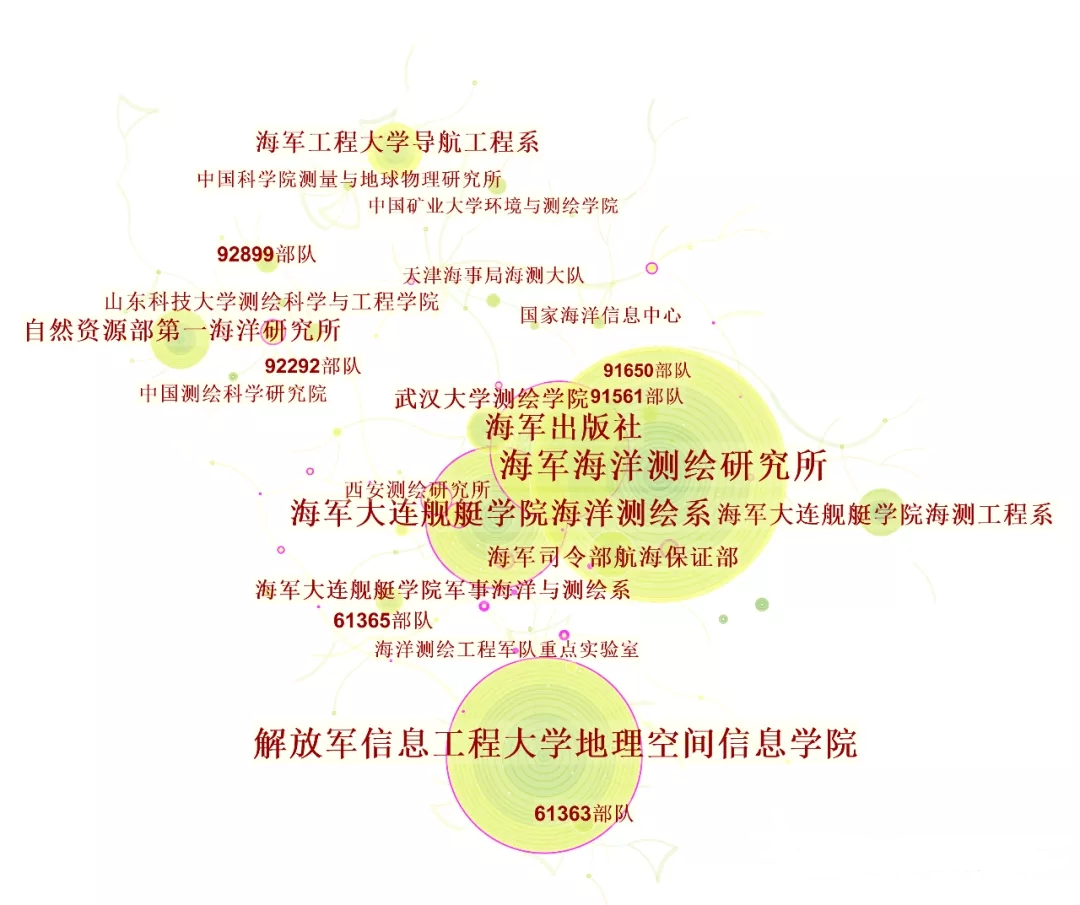 1 s7 m, C: W$ \& i 科研机构作为宏观研究主题,分析研究机构的发文和合作网络有助于探明某领域的力量分布。通过对《海洋测绘》载文的研究机构分析,得到发文机构图谱(图3),发现总体上发文机构以军事研究院所为主,其中以海军海洋测绘研究所、海军大连舰艇学院(含海洋测绘科学与工程系、海测工程系、海洋测绘系)、海军出版社、解放军信息工程大学(含测绘学院、地理空间信息学院)和海军工程大学导航工程系为核心机构形成了关键的研究网络。从数量上看,有23家机构的发文超过了20篇,其中16家为军事科研院所,统计表明海军海洋测绘研究所发文超过400篇,合作机构超过80家,海军大连舰艇学院和解放军信息工程大学发文超过300篇,合作机构超过30家,构成了《海洋测绘》发文最多、合作网络最密集的三大军事科研院所。