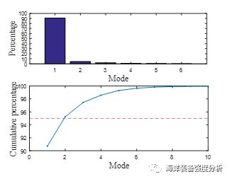 / B9 M3 T/ O0 j4 ~- S' O" f 对实测流速剖面进行模态降维分解结果如图1所示,模态贡献率如图2所示。可见前两阶阶模态的贡献率之和达到95%,剩余高阶模态贡献率之和不足5%,因此从方差贡献率的角度,选取前两阶模态进行流速剖面的变量重组,精度可达95%。另外,一阶模态接近于均匀流,与一般的潮流形态相似,体现出海流的正压性质;二阶模态接近于剪切流,与风生流形态较为类似,体现出斜压性质。 . N1 [; r9 i$ c( j3 l; ]8 b2 b( {" D9 l