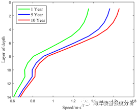# g. J5 e9 h4 {! w# E3 w! S, N 对于水下立管等结构而言,强度设计中主要考虑海流对整个结构所产生的拖曳力影响,因此可取拖曳力作为目标函数,进而通过ISORM确定相应的多年一遇设计域及设计点。得到了1、5、10年三个重现期下的流速设计剖面,可以看出,1、5、10年一遇的设计剖面在空间形态上较为相似,均反映出较强的剪切流特征。 , \& T/ o. A& b6 w* d. d