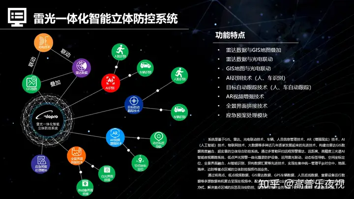 3 O, P; Y4 `- z* K E! u9 R* `- e “高普乐雷光一体化智能立体防控系统”是基于GIS、雷达、光电联动技术,车辆、人员信息管理技术,AR(增强现实)技术,AI(人工智能)技术,物联网技术,大数据等多种近几年逐渐发展起来的先进技术,构建出雷达GIS数据高度融合,超实景的立体综合防控系统。通过多普勒环扫远程预警雷达,远距离、高精度三光谱AI智能夜视跟踪系统,低点声光预警一体化摄录防护设备,运用雷光联动,动态标签导航,空间坐标定位,全景界面融合,AI智能识别,异构数据汇聚等先进技术,实现在集中统一管理平台对空中,地面,海岸,边防等重点区域的立体防控指挥作战业务。