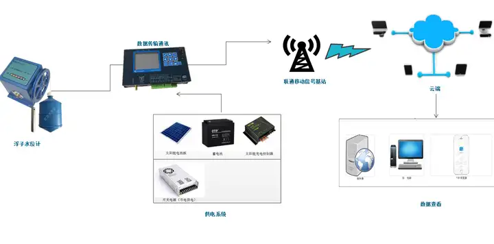 前端感知层:(浮子水位计)水位传感器提供采集功能 通过485信号将采集的水位信息传输至遥测终端机