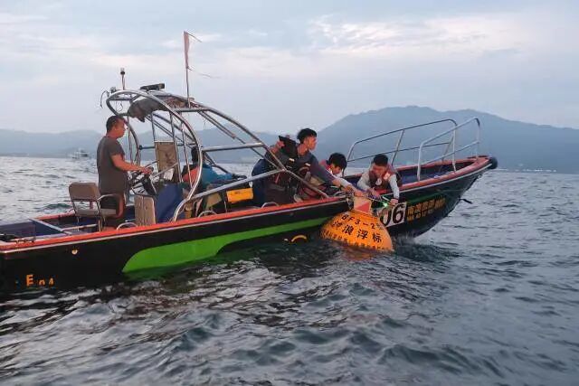 ) p- P: e1 |* z" K6 P' y ▲工作人员在海上放置波浪浮标。