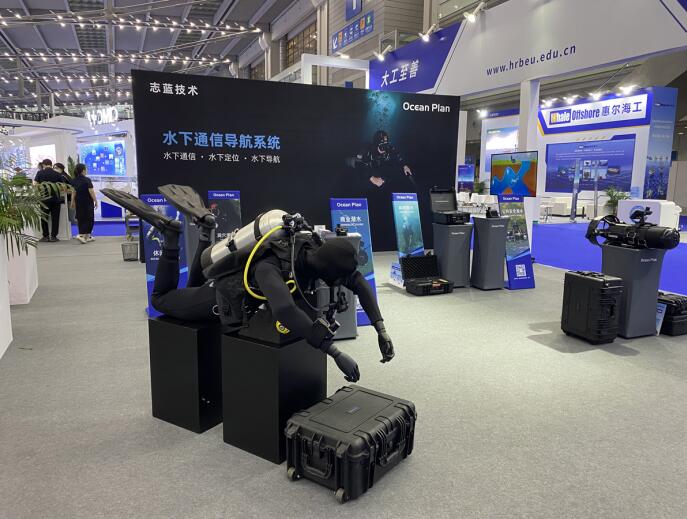 9 |/ d8 h9 s3 ~+ u# A3 Y w 志蓝技术展位现场水下推进器、潜水专业设备等道具真实还原了潜水员水下活动场面,生动展示了水下通信导航系统的应用场景,令人眼前一亮。与现场大型海洋设备不同的是,水下通信导航系统聚焦水下人员的安全和协同,解决水下定位和通信难题,帮助潜水员应对多种水下情况,保障潜水员的安全,提升水下活动效率。