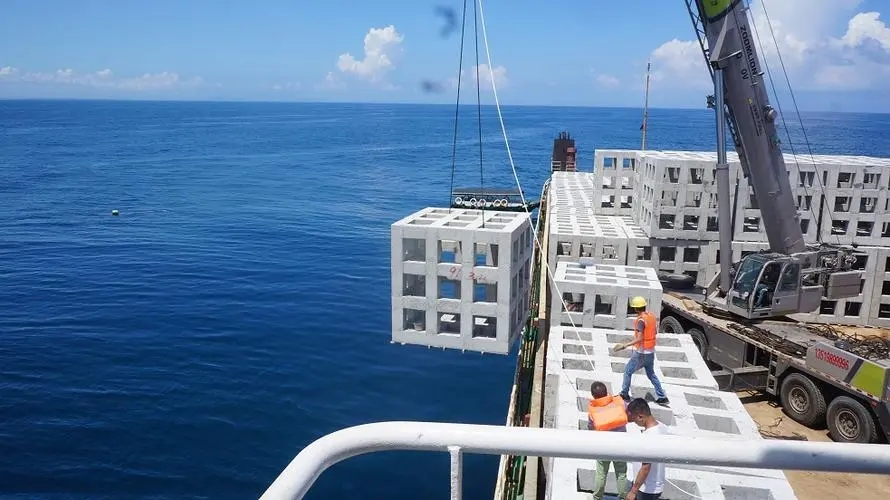 8 X( Q( T5 b( K# m, h 钢筋混凝土礁体投放到海底,图片来自海南省海洋与渔业科学院