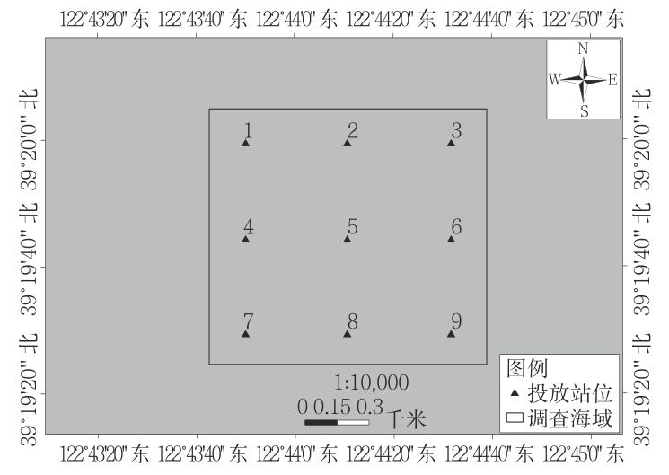 $ G) P3 s. D' k; Y- M% q2 w) H& I 人工鱼礁投放在不同沉积层厚度的海底会产生不同程度的下陷和位移等情况,为了验证基于沉积层厚度进行人工鱼礁选址的准确性,于2020年6月在所选海域内进行人工鱼礁投放。