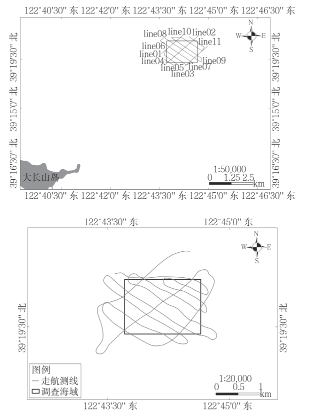 8 q K( m. G( v9 i, h, a 研究海域为大连市长海县大长山岛东北部海域,海域面积1.67km2,中心点坐标122°44′10.828″E、39°19′44.578″N。根据海域范围布置相应的测线,本次勘测共完成11条测线,主测线8条,联络测线3条,测网间距为主测线400m×联络测线400m,勘测路线见图1。