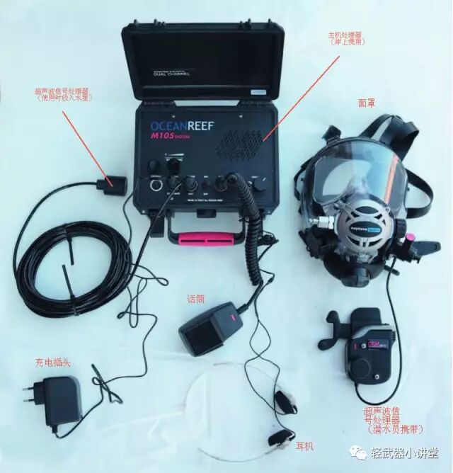 超声波水下通讯设备用于潜水员与岸上指挥员之间的通讯。话筒将指挥员的声音信号转换成电信号,电信号通过主机处理器转换为超声波信号发送到水里。超声波信号处理器接收到信号后,将其转换为电信号,电信号再通过面罩转换为声音信号传输给潜水员
