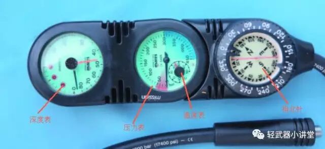 $ @# K7 }6 X+ r* E1 N4 i$ q8 t 潜水仪表,与气瓶相连,是保证潜水安全的重要器材,有单联、双联和三联潜水仪表之分。图为三联潜水仪表,从左到右分别是深度表、压力表(含温度表)和指北针。深度表中的黑色指针显示潜水员在水中所处位置的深度,橙色指针显示出水之前所下潜的最大深度。压力表可显示气瓶内的气压值,内含的温度表则显示当前位置水域的温度。指北针可为潜水员指引方位