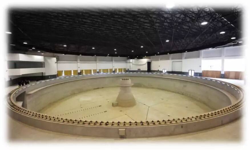 直径45米,水深6米;旋臂长度24.5米,回转臂旋转角速度0.02~1.00rad/s,最大试验模型长度4m。主要由中央岛、旋臂及轨道、拖曳电机、全自动拖车和转盘、六分力测力天平、船坞以及控制测量系统等组成。 4 V+ n! G7 m+ A