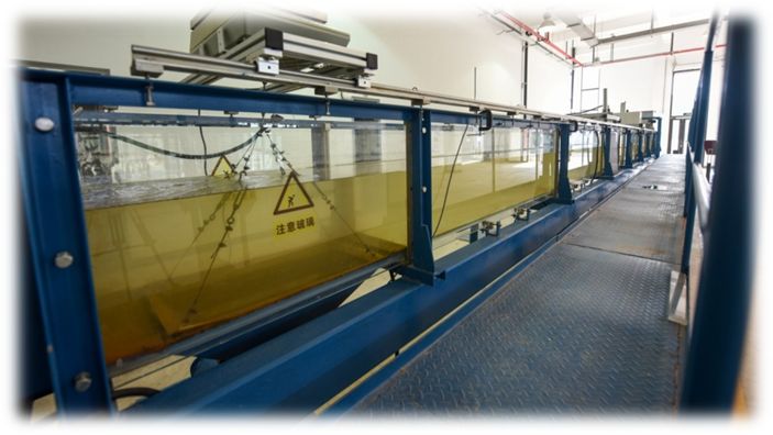 长25m,宽0.6m,高0.5m,变坡0.5%(精度≤±0.1mm),最大流量180L/s,最大水深0.4m,造流精度≤0.02m/s,配有高分辨率PIV系统