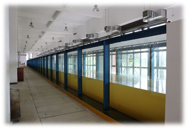 长16m,宽0.5m,高0.5m,变坡2%(精度≤±0.1mm),最大流量120L/s,最大试验水深0.4m,造流精度≤±0.02m/s / O6 K8 Y8 W3 x7 q& u