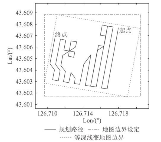 操文芷使用电子海图与雷达图像叠加匹配方式,在此基础上进行无人水面艇路径规划,可有效进行障碍物规避以及局部路径规划动任务。刘强等采用船载多传感器一体化测量技术对海岛礁、港口地区与水中构筑物、湖泊、库区进行测量,完成了对测量区域的水上水下一体化点云无缝拼接。苗润龙等使用基于重复海湾和遗漏海湾的搜索行为设计方法完成了海洋自主航行器多海湾区域完全遍历路径规划试验,规划结果在遍历性、重复率方面优于其他遍历方法。上海大学“精海3号”无人艇水面船在金塘大桥附近按设定的规划航线进行测绘工作,因人为规划航线只能扫测航线所覆盖部分的区域,钟雨轩等提出一种考虑主动方向的动态栅格法与启发式搜索算法的无人水面艇岛礁海域完全遍历路径规划方法,并通过了仿真验证。