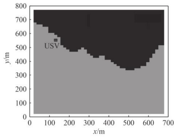 首先,存在一个基本问题,即如何使用地图描述测量区域环境,目前已存在多种地图表示方法,主要分为栅格地图、特征地图和拓扑地图3类。本文采用栅格地图方式,使用占据概率的栅格地图将测量区域分成若干相同边长的栅格,将每个栅格分配概率值以表示被障碍物占据的可能性大小。无人艇搭载导航雷达和深度计设备,实时更新栅格地图,根据路径规划方法生成符合海底地形测量要求的实时梳型路径,能应对复杂环境下各类问题,在实时性和安全性方面具有较强优势。