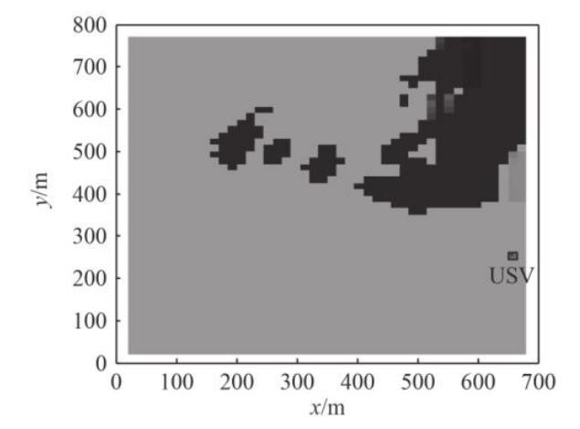 8 D0 m) [; j/ s+ A$ d4 { ⑴USV搭载导航雷达、深度计、多波束测深仪及激光测距仪等设备,使用基于贝叶斯估计的在线地图构建方法,该基准地图与实际环境相比平均误差不大于15m,可保证无人艇航行安全;