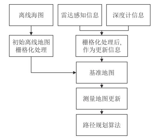 J8 ^/ M1 s$ y 在线地图构建过程如图1所示。其中,基准地图是指由初始离线地图和实时的雷达感知信息以及水深等信息所构建的实时地图,地图北向为等深线由深至浅方向;测量地图是由基准地图作为输人,根据水深情况以及海底地形测量标准需求更新栅格大小,该地图直接用于测量路径规划算法输人。