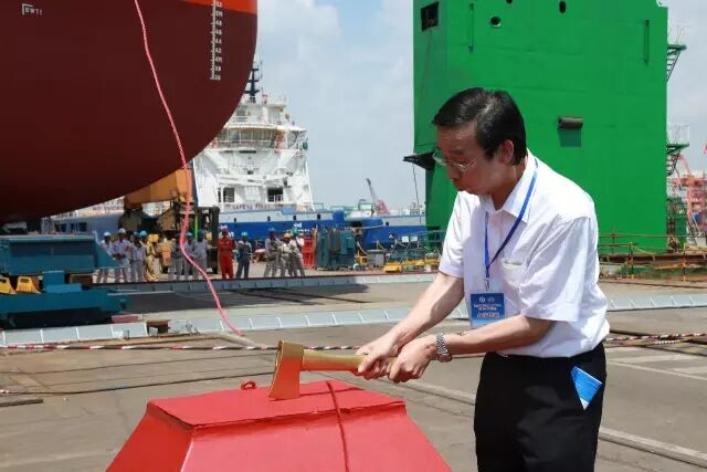 $ P8 \: M# h: E% }2 [8 w 广州海洋地质调查局局长叶建良为“海洋地质十号”出坞下水敲香槟 * [+ F- F' G9 W, K. Z I* F+ g