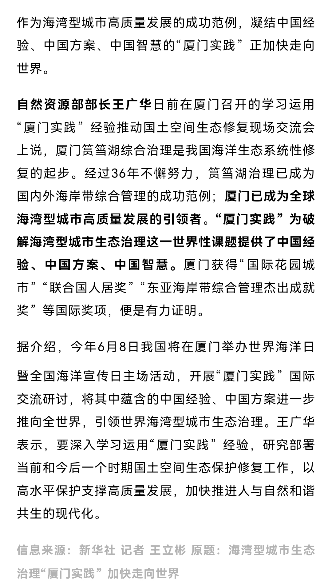 自然资源部部长王广华:厦门已成为全球海湾型城市高质量 ...