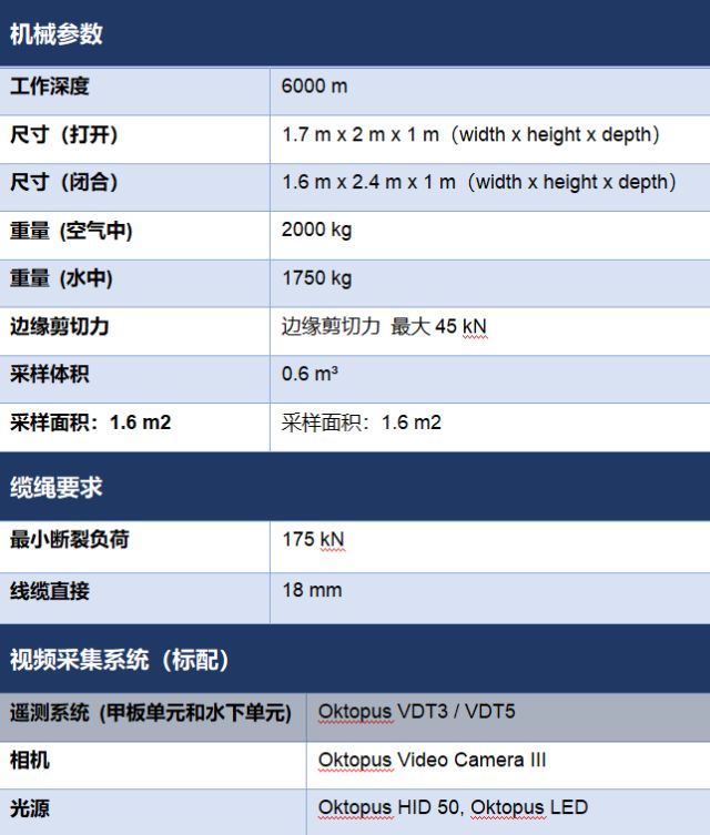# Z( s) r! R" K! G! K0 i Oktopus Video-Guided Hydraulic Grab(VgHG)电视抓斗可以完成箱式采泥器无法完成的采样任务. 由于他的高自重(2t) 和极大的边缘剪切力 (45 kN max.), 电视抓斗甚至可以穿透粗砂和石块。它搭载了Oktopus 遥测系统和液压系统, 通过同轴电缆可以进行操作和信号传输,可以将高分辨率原位彩色图像和采样进程传输至电脑. 它还可以集成各种传感器(CTD等). VgHG在德国获得了挪威船级社认证的科学仪器-德国劳氏船级社(DNV GL) 点击边框调出视频工具条 # p2 A' T6 O5 G) [