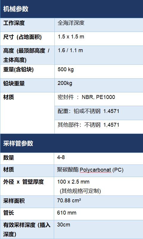多管采泥器也是重力采样器的一种,相比于柱状采泥器,多管采泥器可以一次性采集多个无扰动沉积物样品。 Oktopus Multiple Corer 视频多管采泥器有超过30年稳定使用的经验,在全世界现有200多套Oktopus Multiple Corer正在使用中。视频多管采泥器搭载自主式高清深海摄像系统,可记录采样过程及采样环境的高清影像。相比于其他产品,Oktopus Multiple Corer 具有更加人性化的设置,更牢固的品质,全系列产品都支持样品管以及相关模块的快速更换。有效采样深度可以通过插入深度限位器进行调节。设备可额外搭载传感器、CTD等模块。