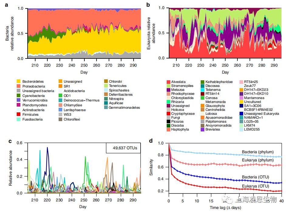 基于16s及18s研究,共获得49637个OTUs,其中9660个OTUs存在时间超过10天,这些物种之间存在群落内的相互作用关系,被用于检测微生物群体在自然状况下如何形成动态相关性群落。从群落结构的动态变化分析中(下图)可以看出,在较高的分类级别(门到科水平),群落动态相对稳定,但细菌及真核生物群体中几乎每天都存在迅速的波动。