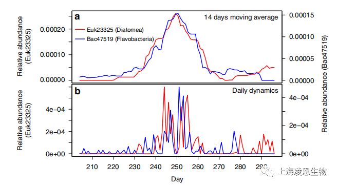 海洋浮游生物中所有的分类群几乎每天都会有巨大的丰度波动,微生物的群体也会被明显的划分为不同的群落,这之间的替代过程发生的急剧而迅速。借助时间顺序性研究的方法可以同时展现区分群落边界的群体的扩张,以及该群落内物种间的正负相关关系。 / J5 r- J k" S3 K# M9 l5 j( g5 ^9 x
