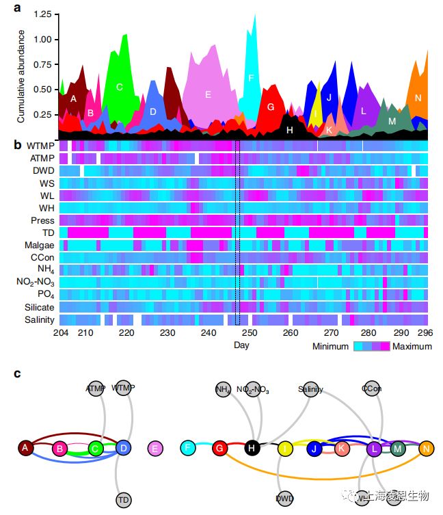 2 ? Z+ w! e! U+ ?: Q5 V 进一步,研究者对急剧快速的群落快速进行研究发现:随着时间的推移,分类群之间的关联是由不同的OTU群具有高度组织性的构成,正如预期的那样,相互作用的生物群之间具有凝聚性表现。这些群体会发生迅速的变化,在几天内达到丰度峰值。而在长时间范围内,它们往往保持较低的丰度水平,只会出现偶发性的高丰度(下图a)。一些种群出现了相同的变化趋势(图a),同样的伴随着环境因素随时间的变化(图b)。这种较长时期内的正相关表明,整个生态系统的变化选择了一致的生物群,可用于预测在较短的时间标度上的正负相互作用。