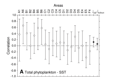 0 \3 S- n2 t9 l f# {! b* o4 c 从浮游植物丰度与SST之间的关系分析可以发现,仅有A6和B6两个区域的置信区间均位于0.0以上,所以,A6、B6呈显著相关,而其他各个区域的浮游植物丰度与SST及rall、rsubset均无显著相关性,因此无法表明总体上有线性关系。