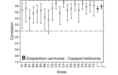 从上图分析可得,次级消费者丰度与草食性桡足类之间存在非常显著的正相关关系,除了C1区域外,相关性都是单独显著。又因肉食性浮游动物丰度与SST无显著关系(rAll=0.11, Z=1.63, n.s.; rSubset=0.12, Z=0.88, n.s.),表明草食性桡足类对肉食性浮游动物具有自下而上紧密而一致的控制作用。
