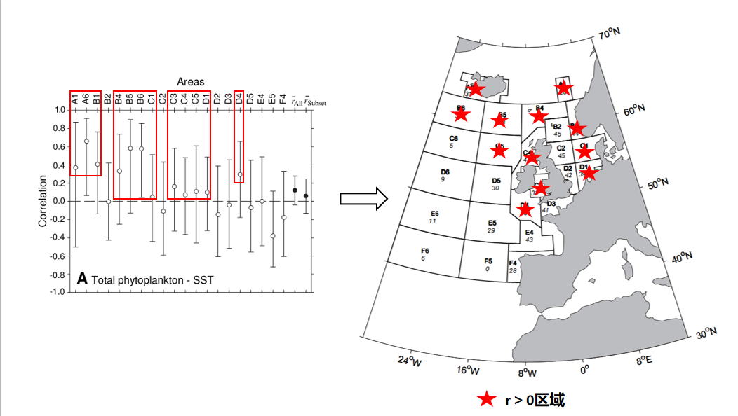 综上,研究者发现,相关系数r>0的区域均位于气温较低的高纬度地区,表明在大西洋东北部较冷的水域,浮游植物的丰度随着SST增加而增加;而相关系数r<0的区域均位于气温较高的低纬度地区,表明在较暖的水域,浮游植物的丰度随着SST增加而减少。 ; S: _( o% Y$ q# J