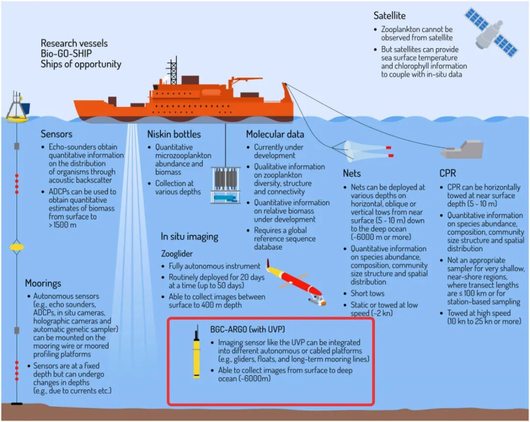 ; K- X! i* B# p: l5 m0 ~ 摘要:随着全球气候变化的加剧,浮游动物的生态系统功能正在发生变化。而目前,由于采样技术及方法的限制,浮游动物监测存在数据不足及覆盖范围地理空缺的问题。最新发表的Nature综述文章提出将传统研究工具(网采)与新技术(原位成像)和组学相结合的方法,以监测浮游动物种群,并特别提出:可以利用UVP6帮助提供关于浮游动物的观测数据。 浮游动物是海洋生态系统的重要组成部分,它们是初级生产者与鱼类、海洋哺乳动物和海鸟等更高营养级之间进行能量转移的重要途径,并通过直接和间接的反馈方式影响海洋生物地球化学循环。近年来,对浮游动物生理学、群落组成和分布进行的研究表明,浮游动物对海洋气候变化非常敏感。由于海洋温度升高,浮游动物发生了许多重要的变化,如物候学、分布范围和粒径结构等方面的转变,并进而改变生物地球化学循环、能量传递途径和人类从海洋获得的生态系统服务。